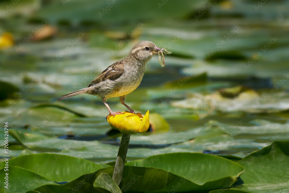 Spatz, Haussperling (Passer domesticus) Weibchen mit gefangener Libelle im Schnabel steht auf Gelber Teichrose (Nuphar lutea) - Weikersheim im Taubertal, Deutschland