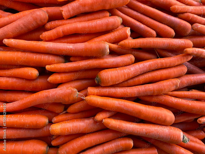 Fresh orange carrots close-up, organic farm vegetables background. Natural healthy food rich in vitamins, vegan diet concept, rustic harvest, raw carrot pile for cooking, salad or juice ingredient.