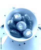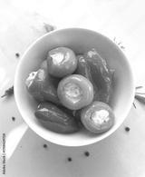 Stuffed orange cherry peppers and bell peppers with creamy cheese filling in white bowl. Gourmet appetizer, Mediterranean snack, delicious antipasto for party, catering or homemade cuisine.