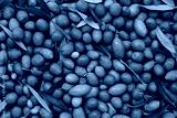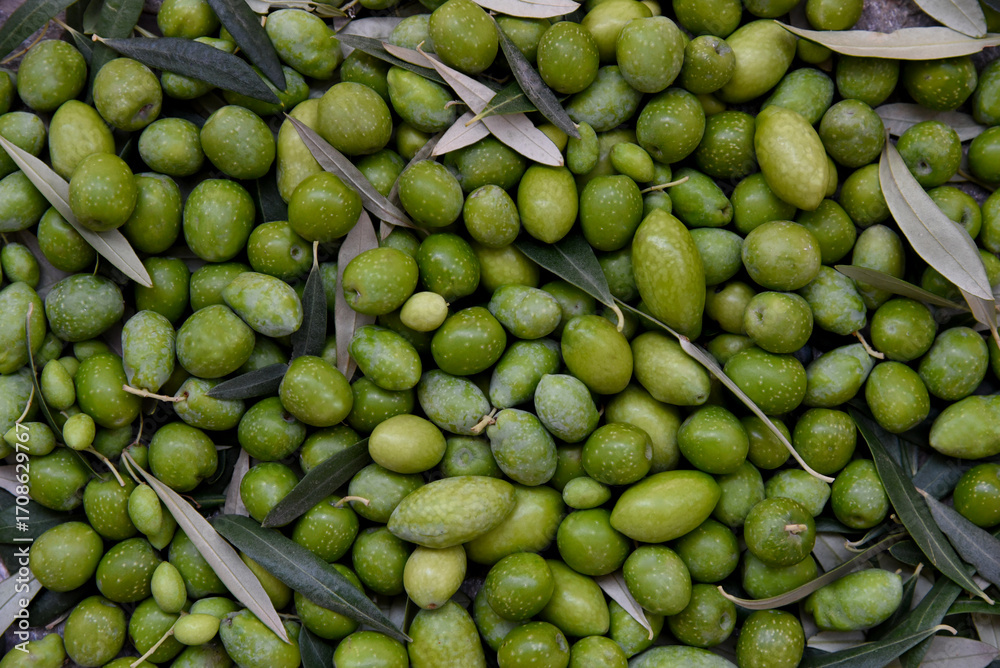 Fresh green olives with olive leaves, natural Mediterranean harvest background. Organic agriculture, healthy vegan food, raw olive fruits close-up, traditional olive oil production concept.