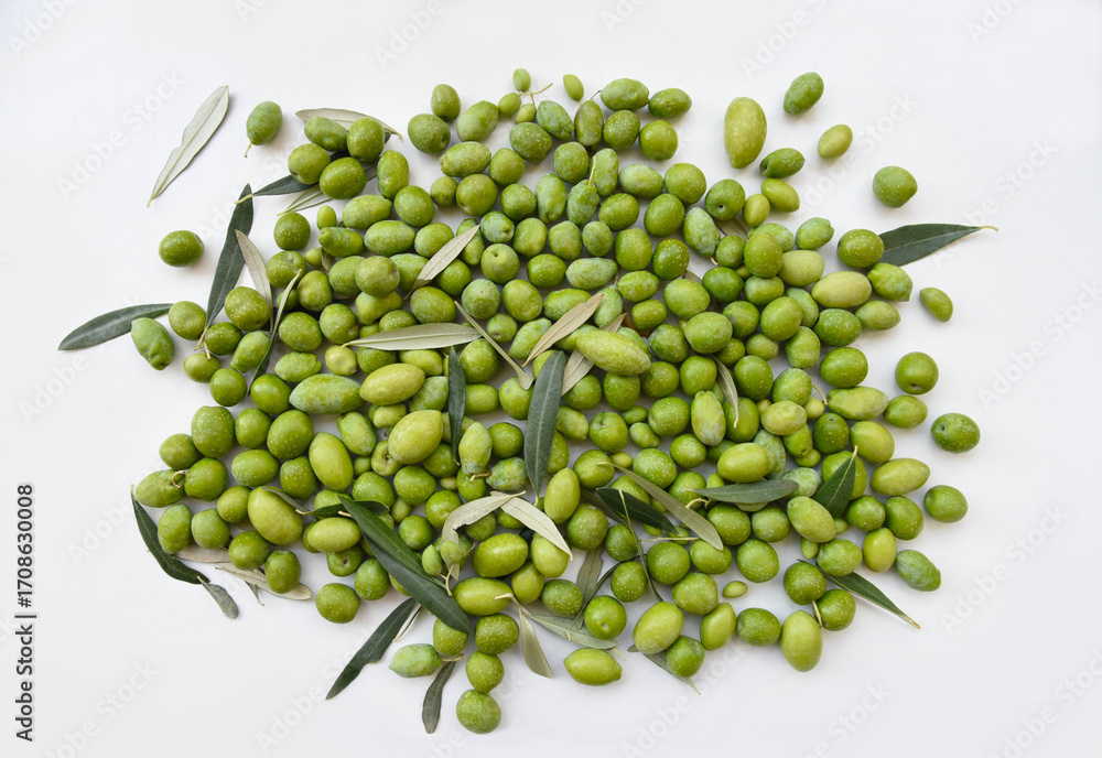 Fresh green olives with olive leaves on white background. Natural Mediterranean food concept, organic harvest from olive tree. Healthy snack ingredient for oil, cooking, and authentic cuisine.