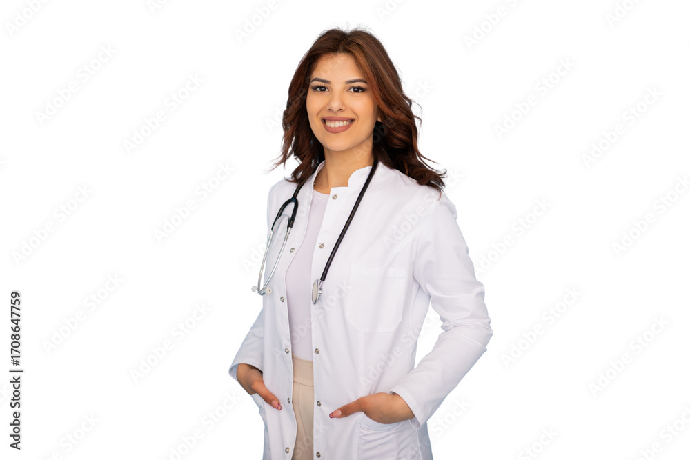 Young female doctor smiling with stethoscope around neck and hands in pockets, isolated on transparent background, representing healthcare and medical profession