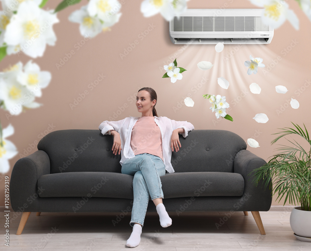 Smiling woman relaxing on sofa at home. Air conditioner keeping comfortable temperature in room