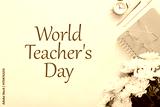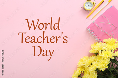 Happy Teacher's Day greeting card with flowers, stationery and text on pink background