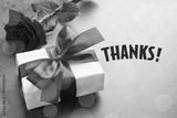 Thank you card design with gift box and rose on grey background, bokeh effect