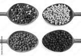 Various types of peppers in spoons isolated on white, set. Top view