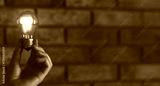 Woman holding glowing light bulb against brick wall, closeup. Idea concept