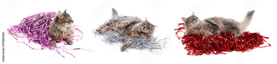Cute furry cat with bright tinsels on white background, collage