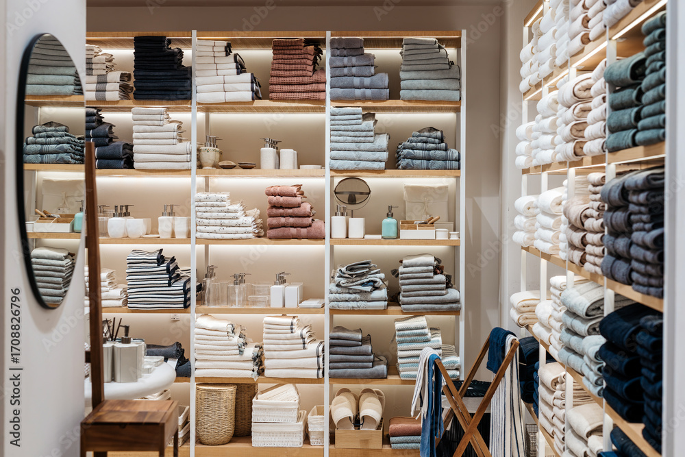 Neatly organized shelves filled with various towels and bath accessories, showcasing a modern interior design with soft lighting and a cozy atmosphere for home decor inspiration