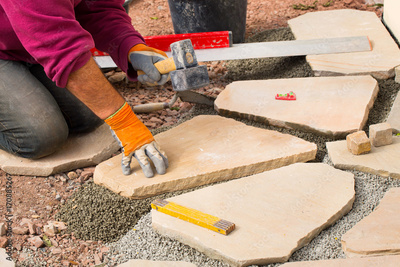Gartenarchitektur - Verlegung von Sandsteinplatten in ein Mörtelbett aus Trasszement und Splitt - Terrasse aus Naturstein
