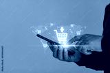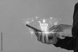 Online shopping concept with man using smartphone and digital cart icon on virtual world map, illustrating e-commerce, mobile retail, global marketplace, internet business and digital marketing.