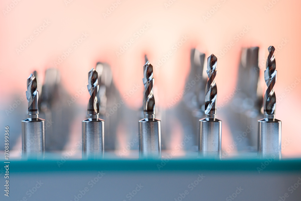 Full set of dental implant drill bits in surgical tray, close-up of professional dentistry equipment
