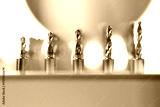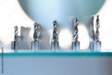 Full set of dental implant drill bits in surgical tray, close-up of professional dentistry equipment