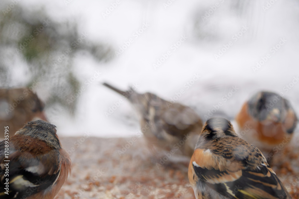 Feeding small finches grain outside the window on a cold, snowy winter day, soft focus