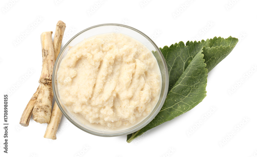Tasty horseradish sauce in bowl, roots and leaf isolated on white, top view
