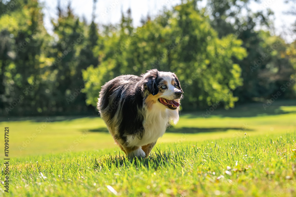 Australian Shepherd Dog enjoying outside at a park on a warm sunny day. Aussie Dog in merle color.