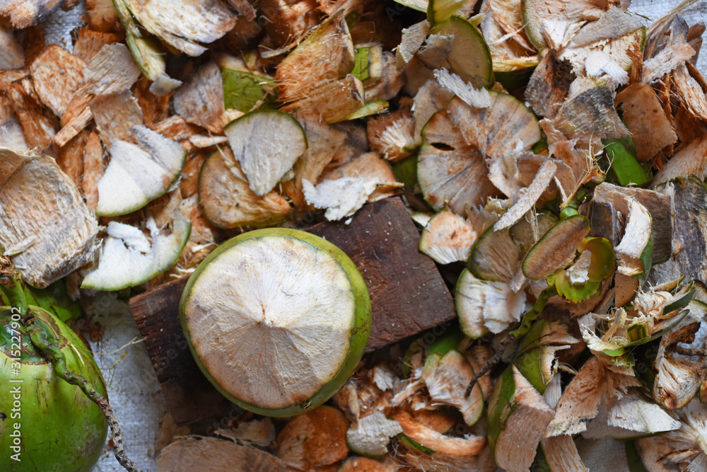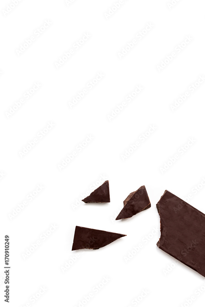 Broken dark chocolate bar isolated on white table. Vertical composition. Top view