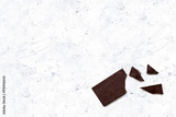 Broken dark chocolate bar isolated on a white marble kitchen top. Horizontal composition. Top view