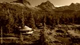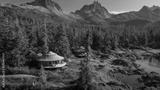 Unique circular eco lodge nestled in a lush green forest with mountains and a lake