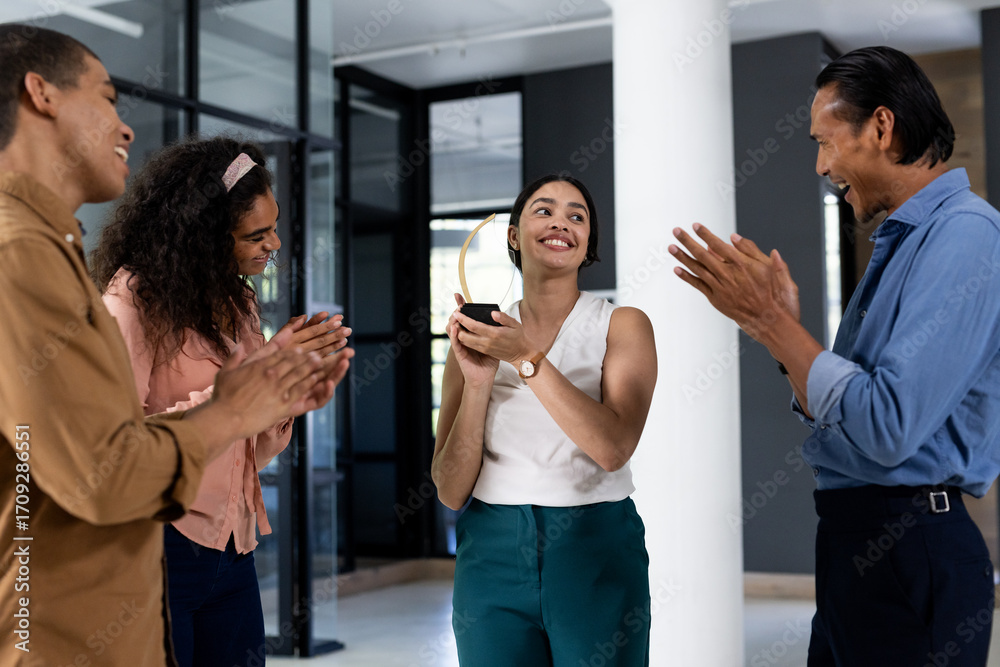 Colleagues applauding woman holding award in modern office, celebrating achievement