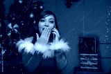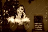A woman dressed as an helper to Santa Claus is surprised while talking on the phone.