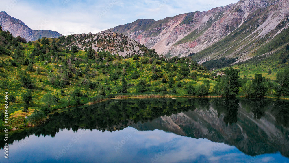 An emerald mountain lake mirrors the Tien Shan slopes in Sary Chelek Biosphere Reserve, Kyrgyzstan