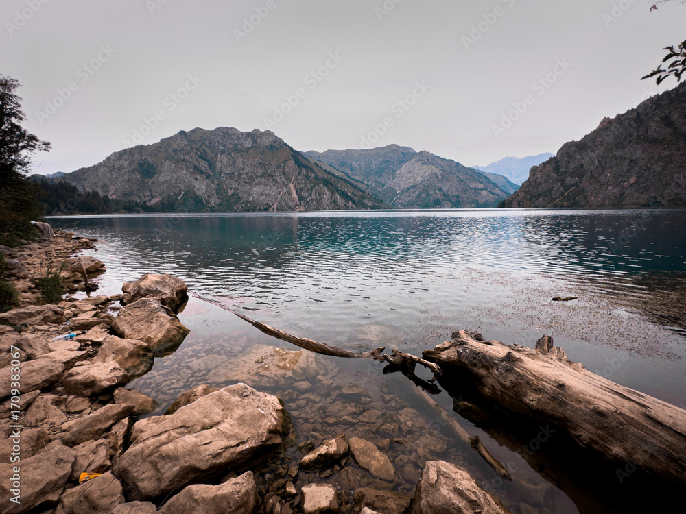 Rocky lakeshore and turquoise waters at Sary Chelek, Kyrgyzstan