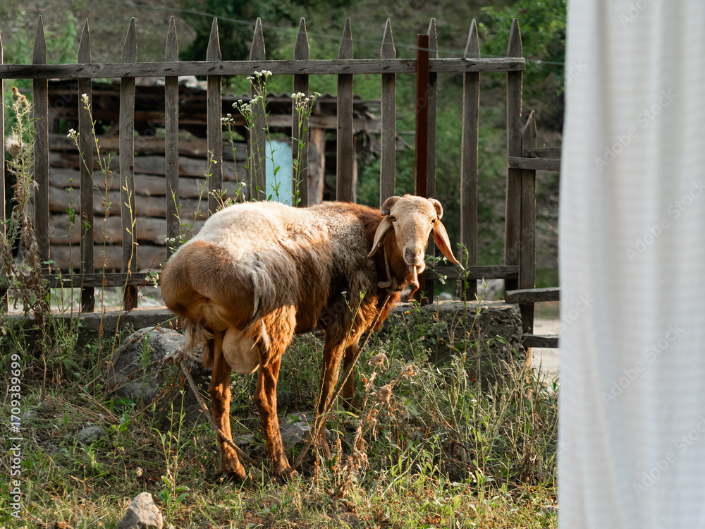 Sheep standing by a rustic wooden fence in warm evening light