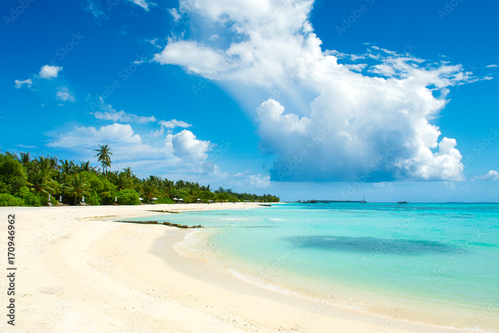 Beautiful sandy beach with sunbeds and umbrellas in Indian ocean, Maldives island