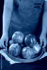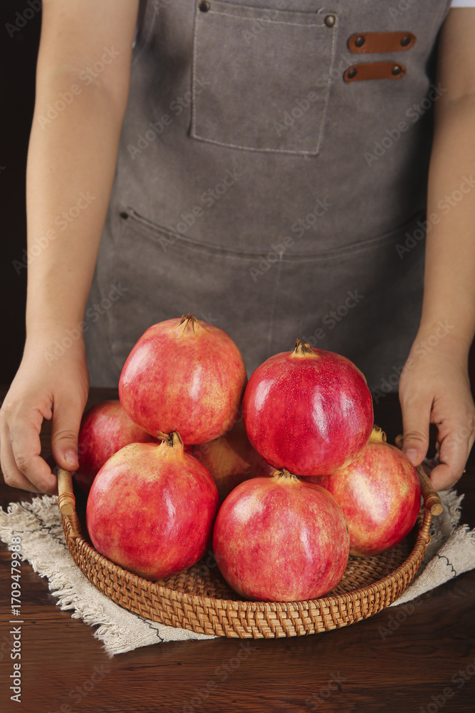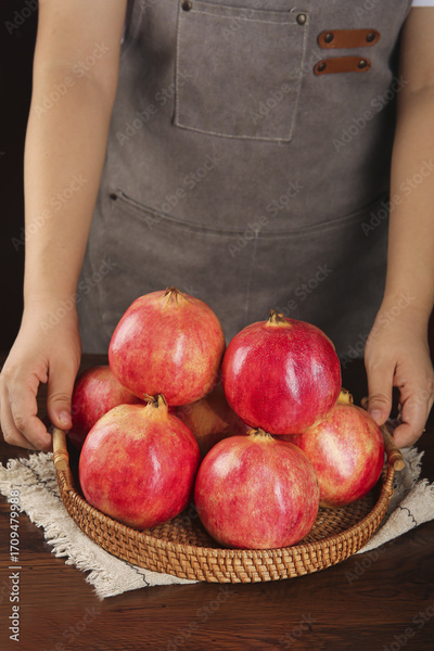 Fresh Red Pomegranates in Wicker Basket Held by Woman in Kitchen Apron