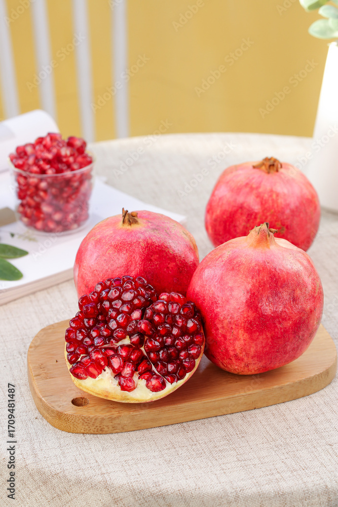 Fresh Pomegranate Fruit with Seeds on Wooden Board - Healthy Organic Food Photography