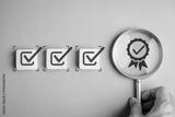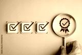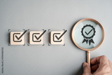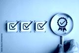 Checklist and assurance concept with approval mark, quality certification and compliance verification. financial audit, business standards, ISO certification, and risk management.