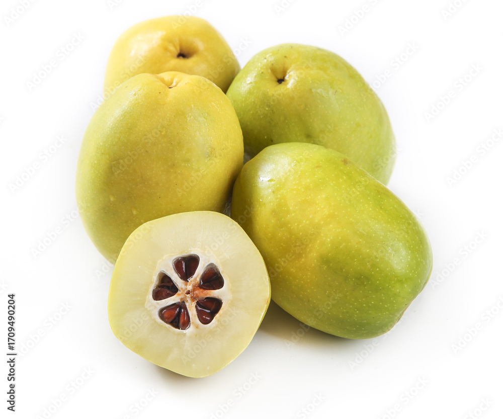 Fresh Green Yunnan Papaya Fruits with White Flesh and Seeds on White Background