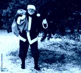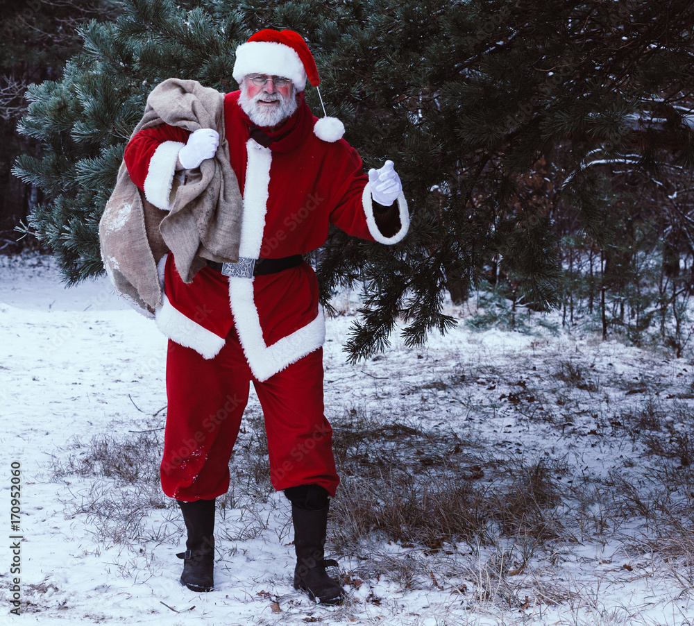 Santa Claus in the winter forest with a bag of gifts and greeting