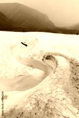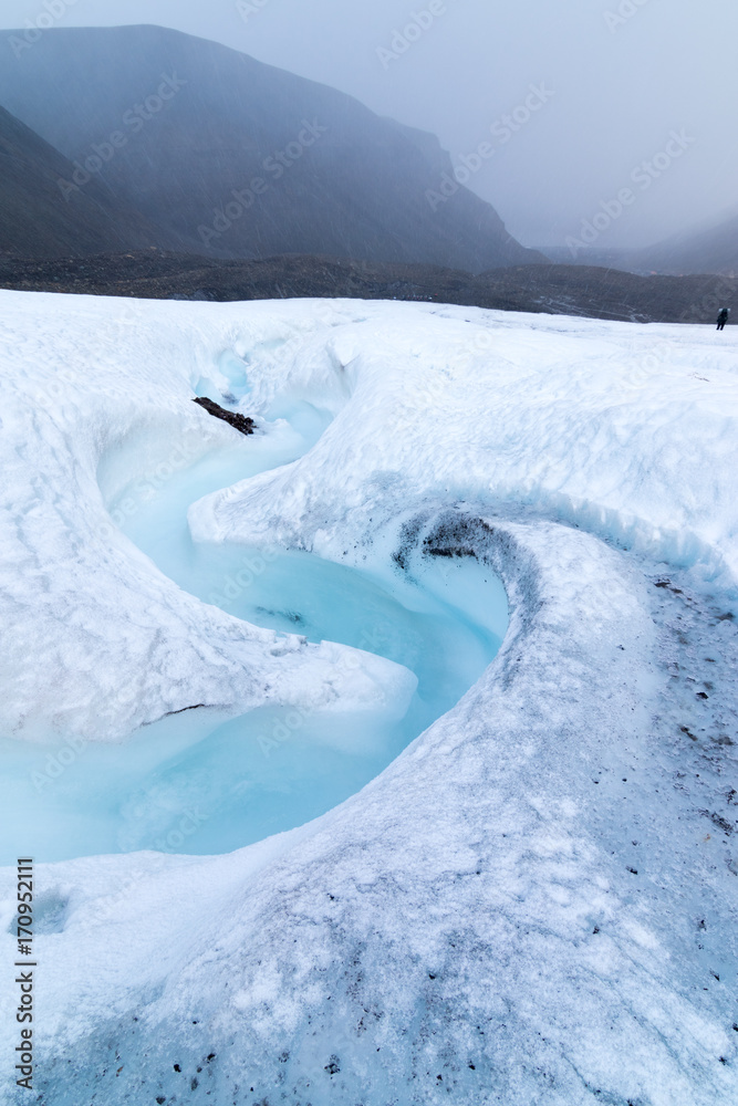 Meltwater stream flowing down from Longyear glacier, Svalbard in the Arctic. Close up view of thawing glacial moraine and global warming problem