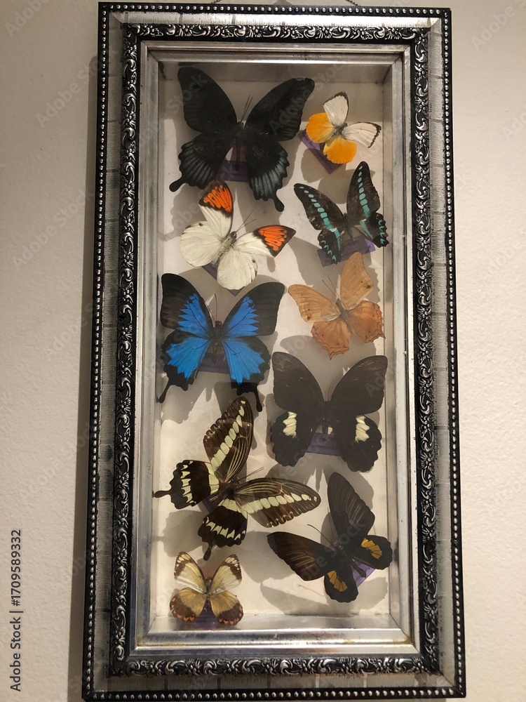 Framed butterfly collection display on wall