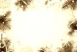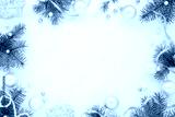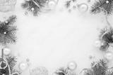 Holidays frame of new year`s decorations on white background. Fir branches, balls, ribbon and pearls, pastel colors