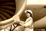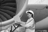An Asian woman stands confidently in front of a jet engine,wearing a safety helmet reflective vest,holding tablet,representing aviation engineering,safety inspection,professional roles in airline