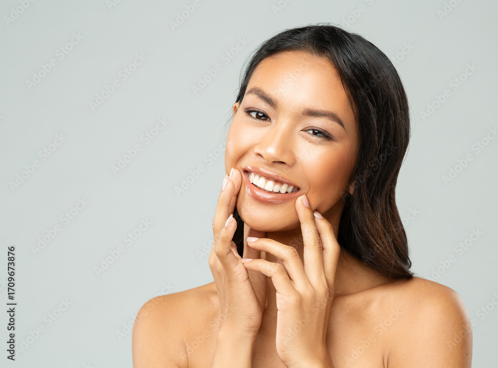 Happy Asian Woman with Perfect White Teeth Smile. Women Lips Treatment. Mouth Care. Beautiful Korean Girl Plastic Surgery. Face Dermal Filler and Lip augmentation. Permanent Makeup