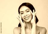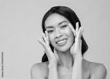 Happy Asian Woman with Hands on Eyes. Women Face Skin Care Treatment. Laser Vision Surgery Correction. Dermal Fillers cosmetics and facial hydration