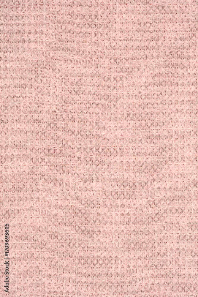 An even, full-frame shot of a pink, finely-woven, cotton waffle-knit fabric