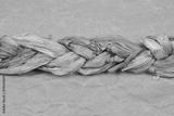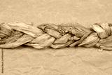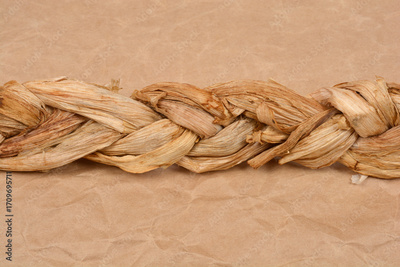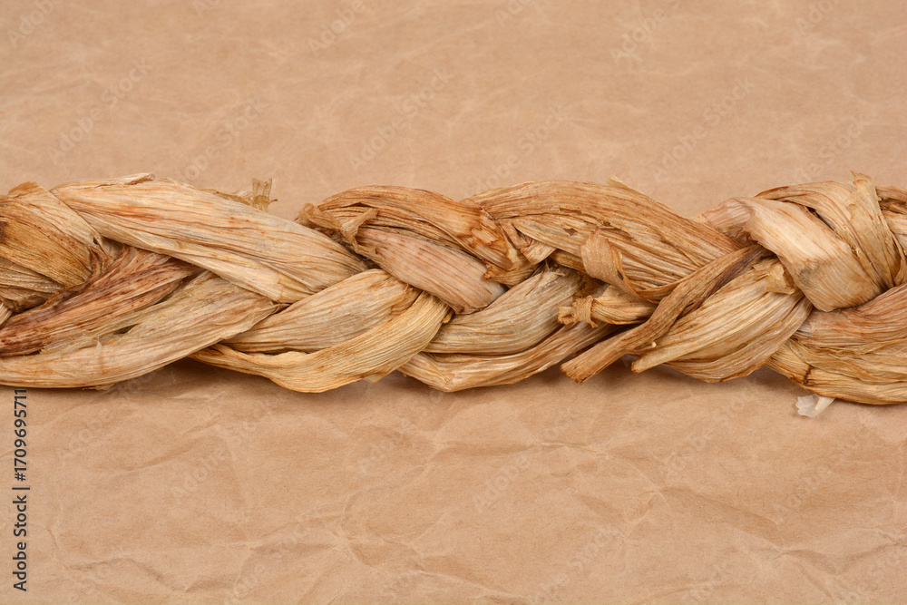 A close-up shot of a rustic, hand-braided strand of dried natural fibers, lying horizontally on a brown paper background