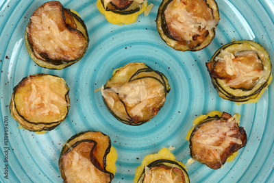 A close-up of baked savory polenta and fried zucchini bites with melted parmesan cheese