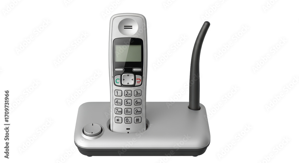 Isolated cordeless telephone with base and antenna is on a neutral surface for home or office