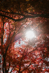 Vertical image of the beautiful red coloured autumn leaves of the Japanese maple trees with sunshine outdoor at daytime during fall season in Japan.