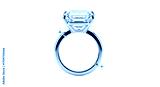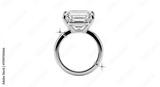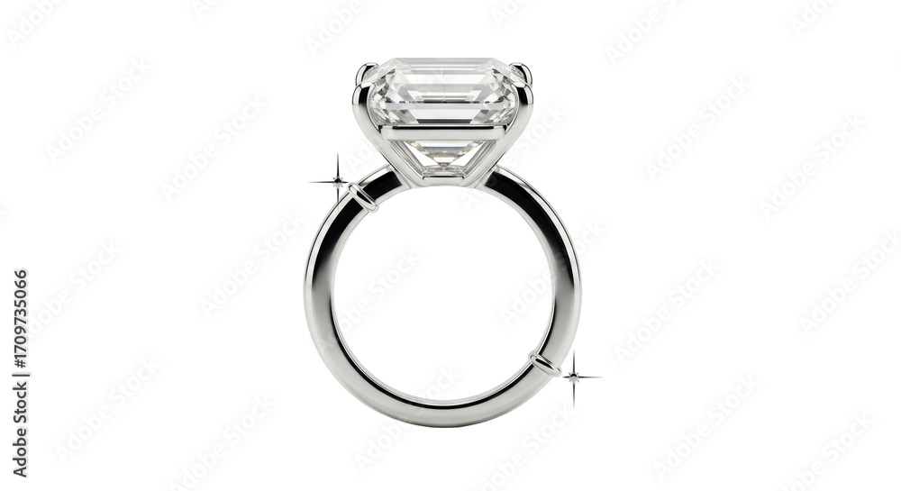 Isolated engagement ring with emerald cut diamond set in platinum band for celebration