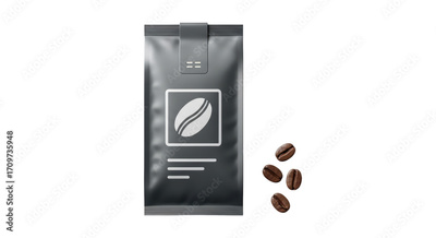 Isolated coffee beans with bag container, a perfect blend of natural freshness and taste