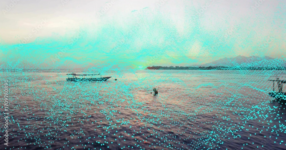 Swimming adult in wetsuit in calm coastal water near covered motor boat with buoy and island