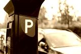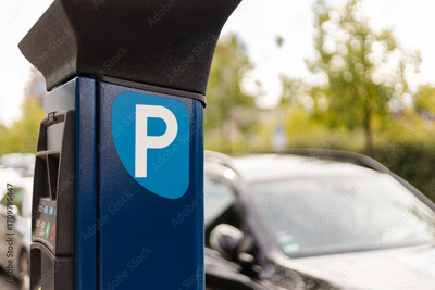 A parking meter is prominently displayed in a clean parking lot surrounded by greenery. Several cars are parked nearby, suggesting a bustling area during the day