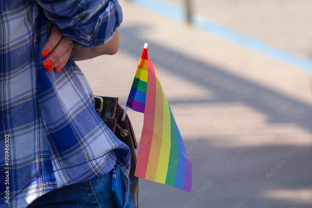 Flag of the rainbow in the bag of the participant of the community lgbt. Symbols